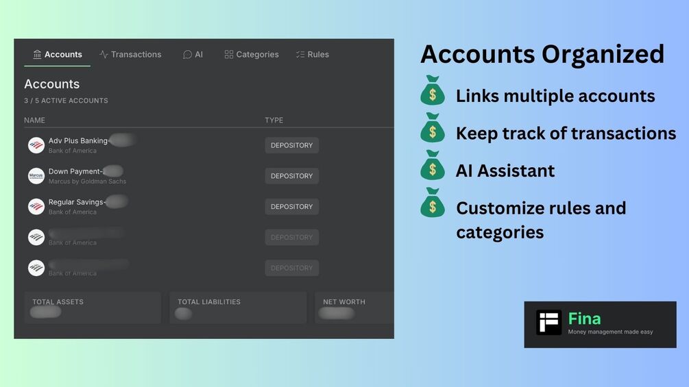 - AI Insights: Get smarter with your money—chat with Fina’s AI to uncover insights and simplify complex financial data.